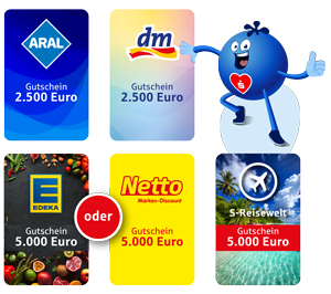 Bezahle bis zum 30. April 2026 mit deiner verknüpften Sparkassen-Card1 bei Aral, dm, EDEKA oder Netto Marken-Discount und sichere dir jedes Mal eine weitere Chance auf ein pralles Gutscheinpaket im Wert von über 15.000 Euro: