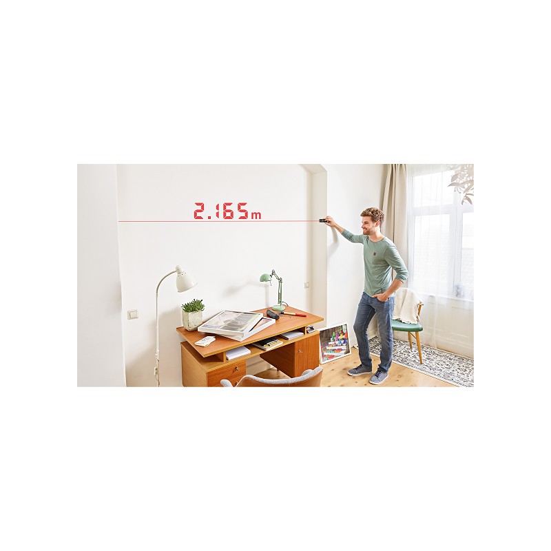 Positionieren, zielen, und mit nur einem Knopfdruck misst der Zamo präzise Entfernungen bis zu 25 Meter. Er berechnet auch die Quadratmeter, und ist deshalb sehr praktisch für die Bestimmung der erforderlichen Menge an Tapeten, Bodenbelägen oder sonstigen Materialien.